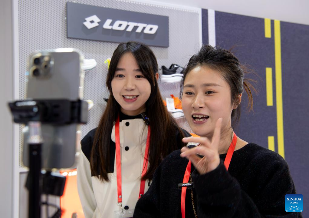 Staff members sell products via livestreaming at the 5th China Marathon Expo in Xiamen, southeast China's Fujian Province, Jan. 4, 2024. (Xinhua/Wei Peiquan)