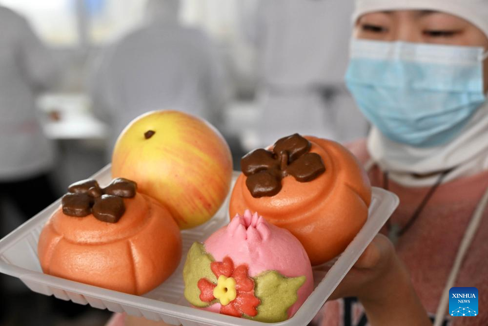 A staff member shows steamed flour products at a food company in Weihai, east China's Shandong Province, Jan. 4, 2024. As Chinese Lunar New Year approaches, traditional food companies in Weihai of Shandong Province increased their capacity of production to meet the market demand. It is a tradition for people in the east part of Shandong Province to have various traditional flour products during the Spring Festival. (Xinhua/Li Ziheng)
