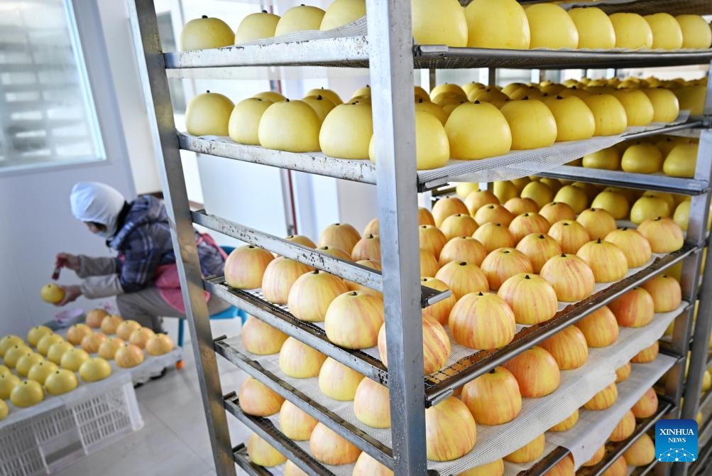A staff member sorts flour products at a food company in Weihai, east China's Shandong Province, Jan. 4, 2024. As Chinese Lunar New Year approaches, traditional food companies in Weihai of Shandong Province increased their capacity of production to meet the market demand. It is a tradition for people in the east part of Shandong Province to have various traditional flour products during the Spring Festival. (Xinhua/Li Ziheng)
