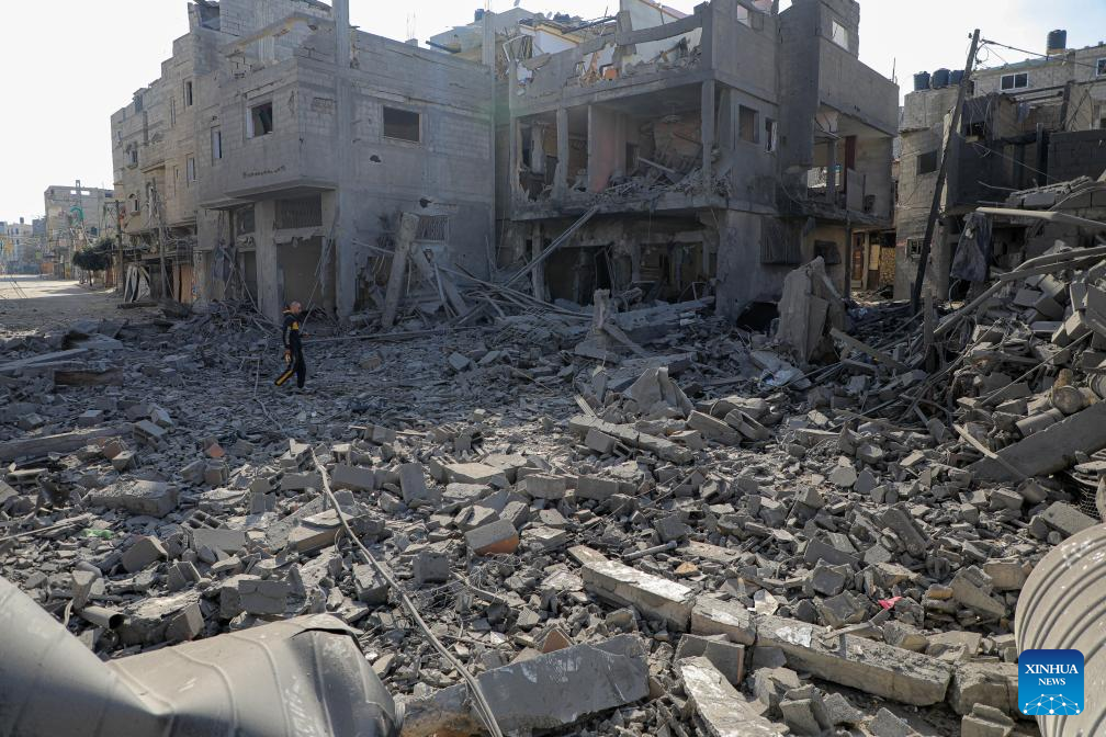 A man walks among the rubble of buildings destroyed in Israeli strikes in the southern Gaza Strip city of Khan Younis, on Jan. 4, 2024. Palestinian death toll from Israeli strikes on the Gaza Strip rose to 22,438 since the Israel-Hamas conflict broke out on Oct. 7, 2023, said the Gaza-based Health Ministry on Thursday. (Photo by Rizek Abdeljawad/Xinhua)