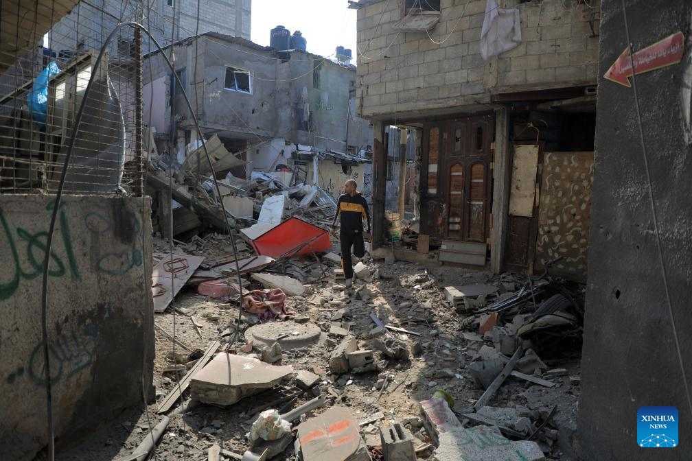 People walk past buildings destroyed in Israeli strikes in the southern Gaza Strip city of Khan Younis, on Jan. 4, 2024. Palestinian death toll from Israeli strikes on the Gaza Strip rose to 22,438 since the Israel-Hamas conflict broke out on Oct. 7, 2023, said the Gaza-based Health Ministry on Thursday. (Photo by Rizek Abdeljawad/Xinhua)