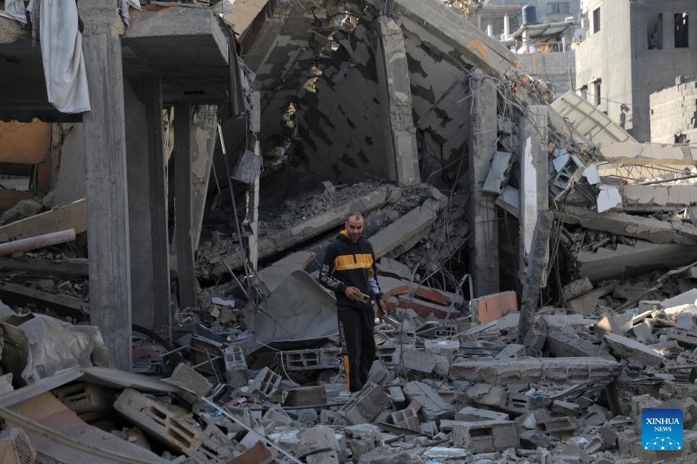 A man stands among the rubble of buildings destroyed in Israeli strikes in the southern Gaza Strip city of Khan Younis, on Jan. 4, 2024. Palestinian death toll from Israeli strikes on the Gaza Strip rose to 22,438 since the Israel-Hamas conflict broke out on Oct. 7, 2023, said the Gaza-based Health Ministry on Thursday. (Photo by Rizek Abdeljawad/Xinhua)