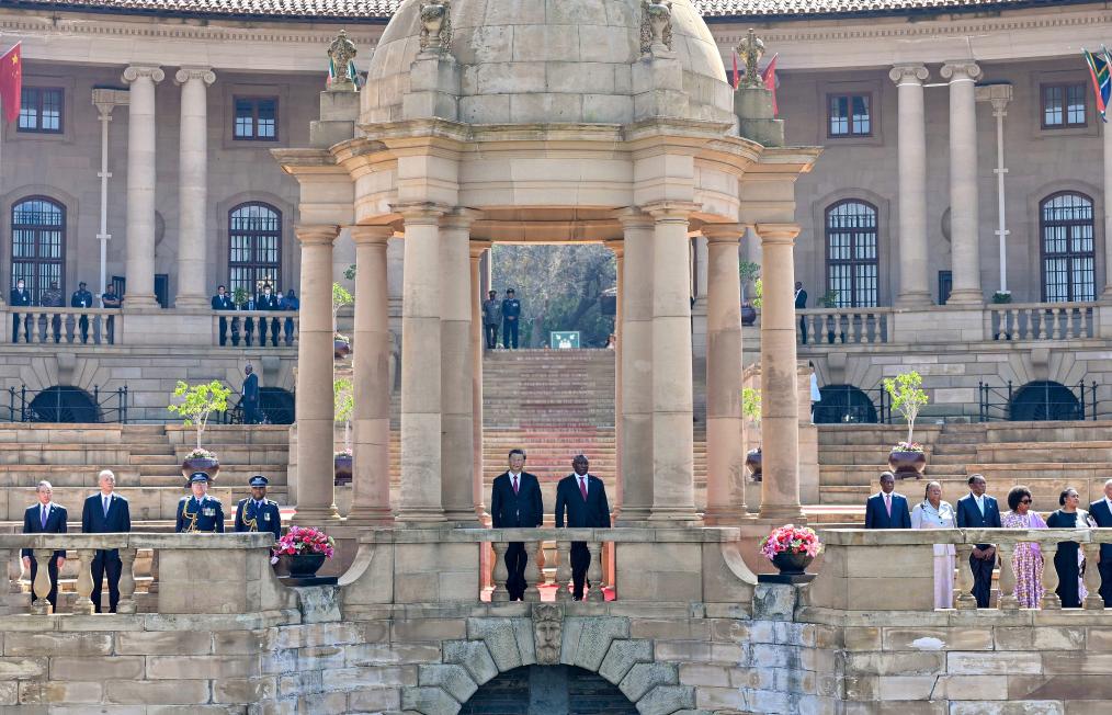 Chinese President Xi Jinping attends a welcoming ceremony held by South African President Cyril Ramaphosa prior to their talks in Pretoria, South Africa, Aug. 22, 2023. (Xinhua/Yin Bogu)