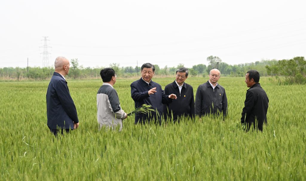 Chinese President Xi Jinping, also general secretary of the Communist Party of China Central Committee and chairman of the Central Military Commission, learns about the cultivation of crops that are tolerant of drought and high alkalinity at a wheat field in Cangzhou, north China's Hebei Province, May 11, 2023. Xi inspected Hebei Province and presided over a meeting on promoting the coordinated development of the Beijing-Tianjin-Hebei region from May 11 to 12, 2023. (Xinhua/Li Xueren)