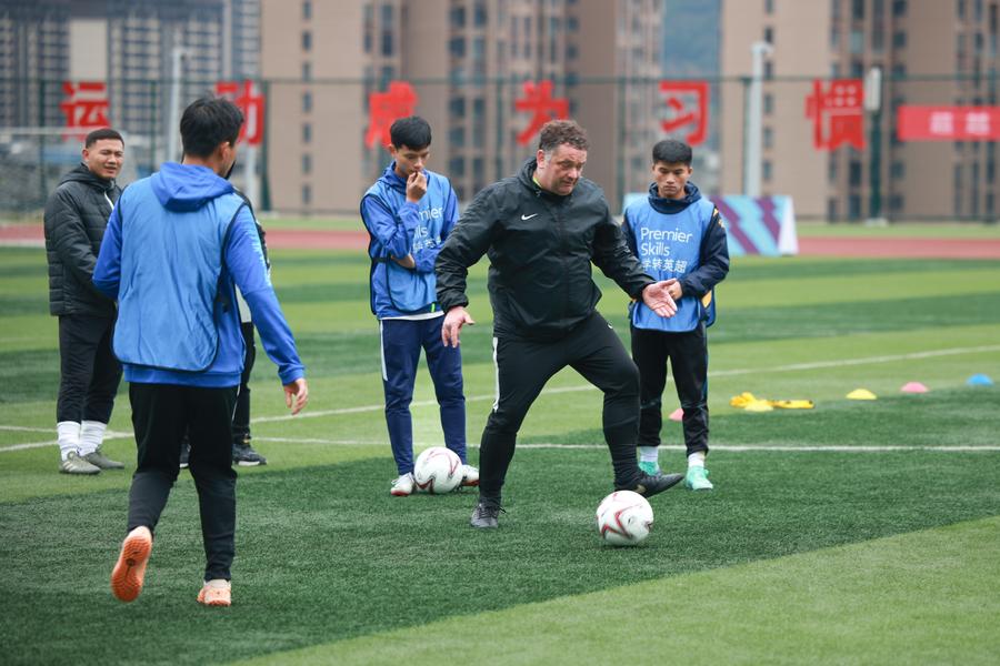 Warren Leat, the British Council's football development manager, conducts a training session for local coaches in a project launched by the Premier League on Dec. 12, 2023. (Xinhua/Liu Xu)