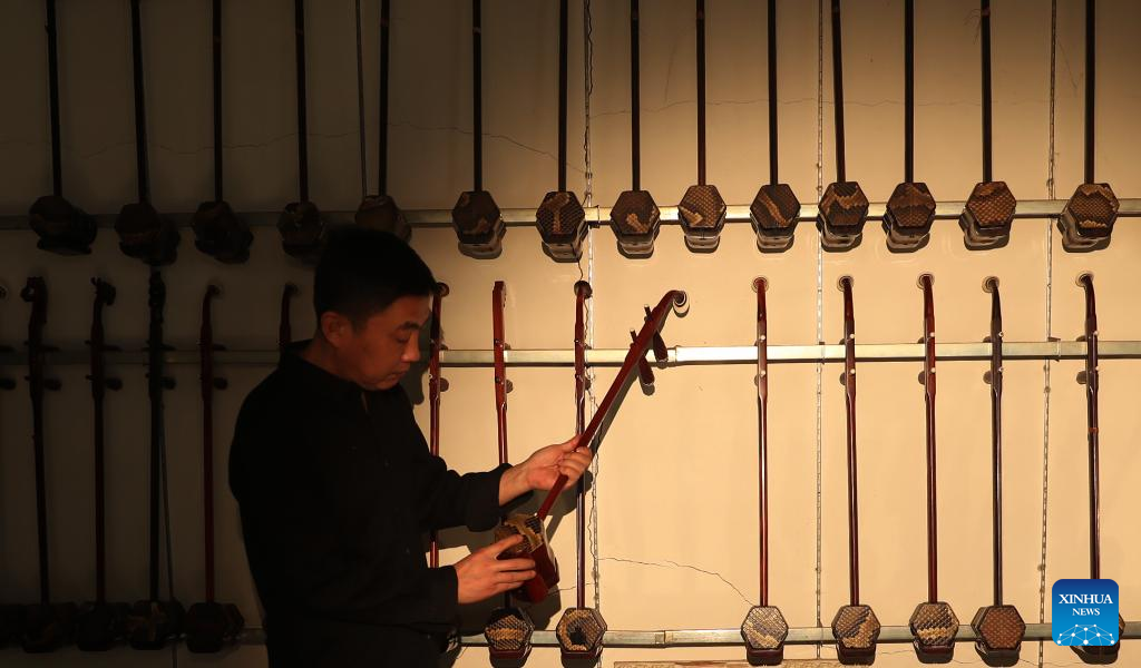 Gong Zhiguang checks and adjusts an erhu in Changtu County of Tieling City, northeast China's Liaoning Province, Dec. 28, 2023. (Xinhua/Yang Qing)