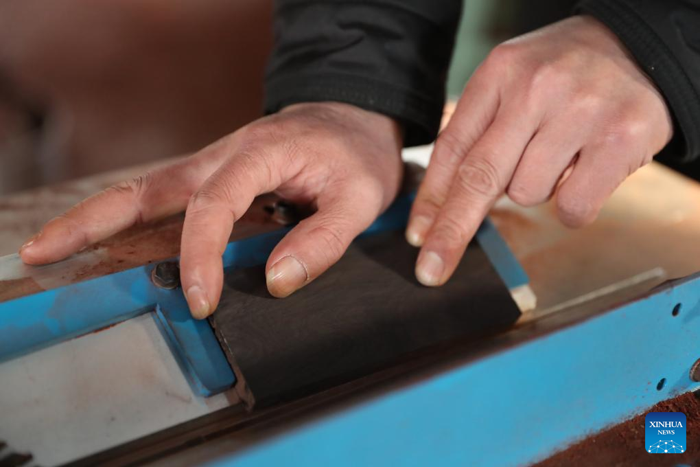 Gong Zhiguang grinds a block for erhu making in Changtu County of Tieling City, northeast China's Liaoning Province, Dec. 28, 2023. (Xinhua/Yang Qing)