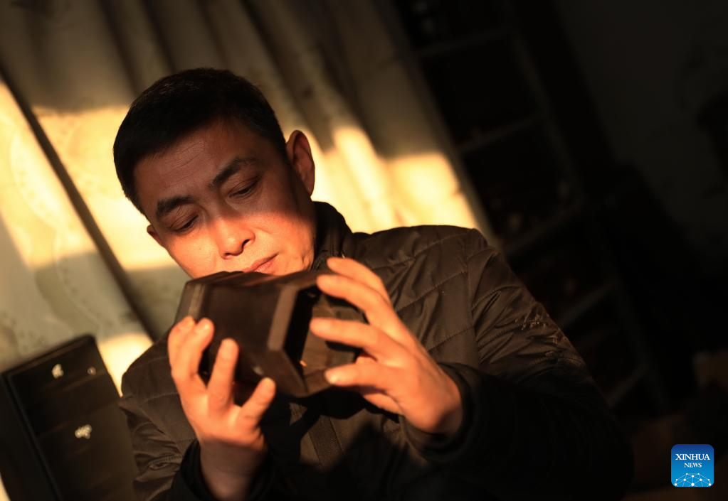 Gong Zhiguang picks a block for erhu making in Changtu County of Tieling City, northeast China's Liaoning Province, Dec. 28, 2023. (Xinhua/Yang Qing)