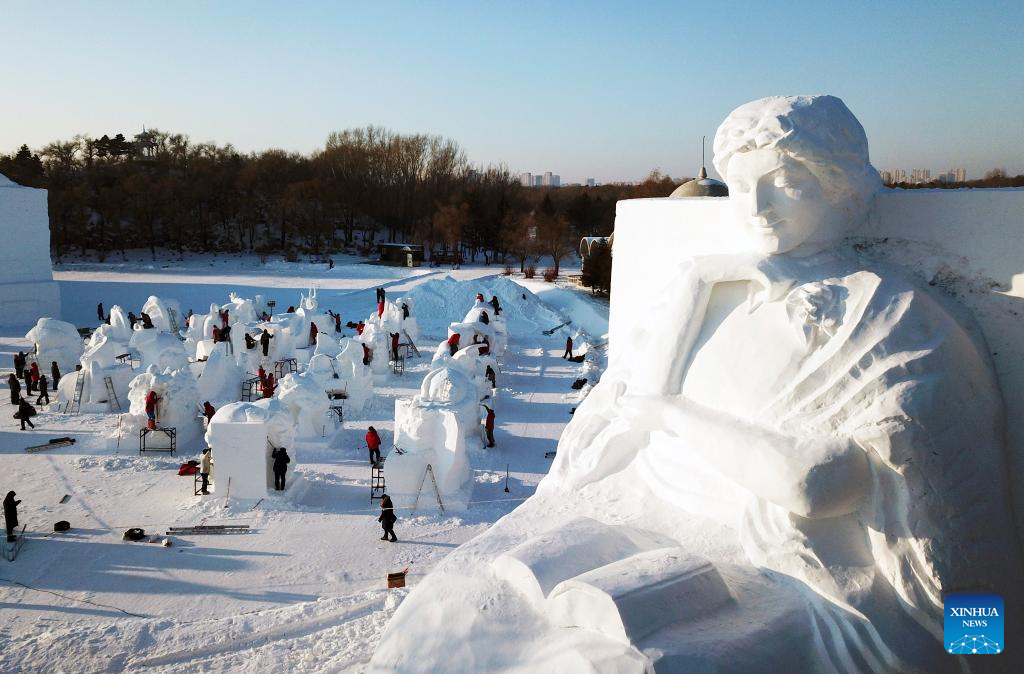 Contestants work on a snow sculpture at the Sun Island scenic area in Harbin, northeast China's Heilongjiang Province, Jan. 7, 2024. An international snow sculpture competition is held here, attracting snow sculptors from 12 countries. (Xinhua/Zhang Tao)