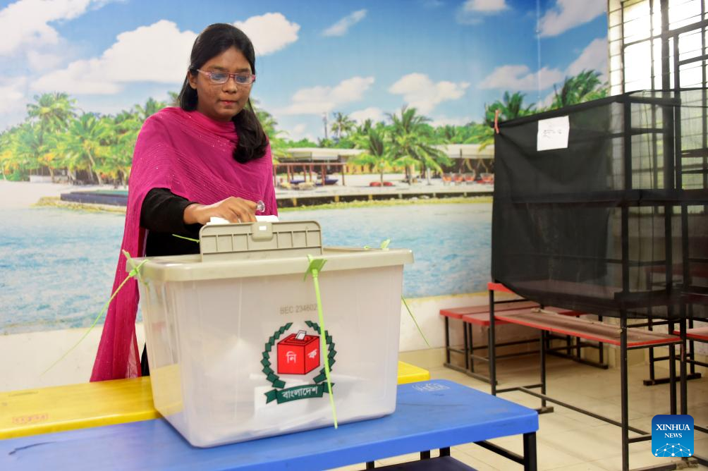 A woman casts her ballot at a polling station in Dhaka, Bangladesh, Jan. 7, 2024. (Xinhua)