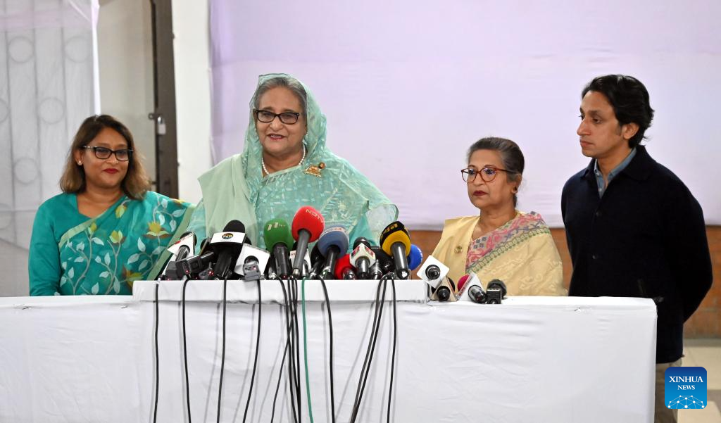 Bangladeshi Prime Minister Sheikh Hasina (2nd, L) holds a media briefing at a polling station in Dhaka, Bangladesh, Jan. 7, 2024. (PID/Handout via Xinhua)