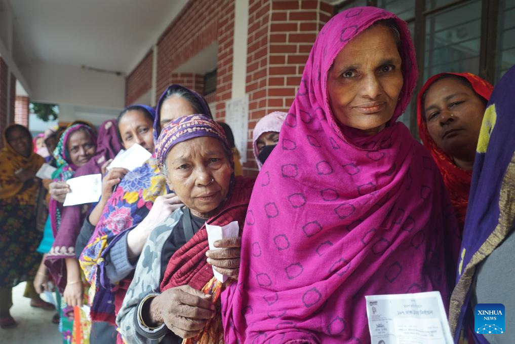 Female voters wait in line outside a polling station in Dhaka, Bangladesh, Jan. 7, 2024. (Xinhua)