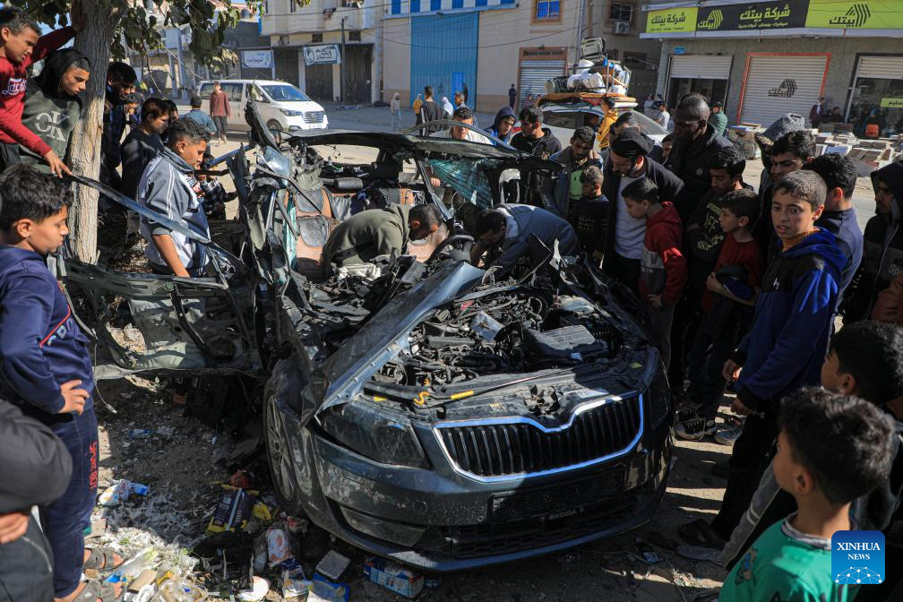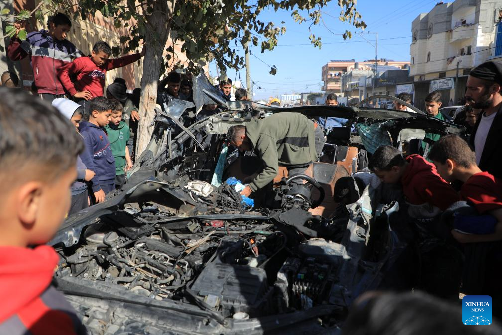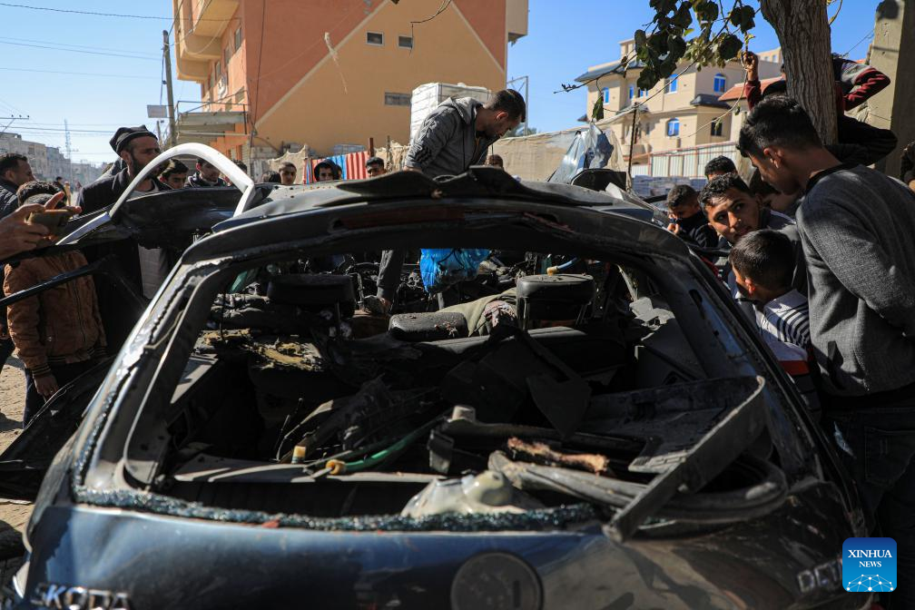 People check the vehicle damaged by an Israeli airstrike in the southern Gaza Strip city of Rafah, on Jan. 7, 2024. (Photo by Rizek Abdeljawad/Xinhua)