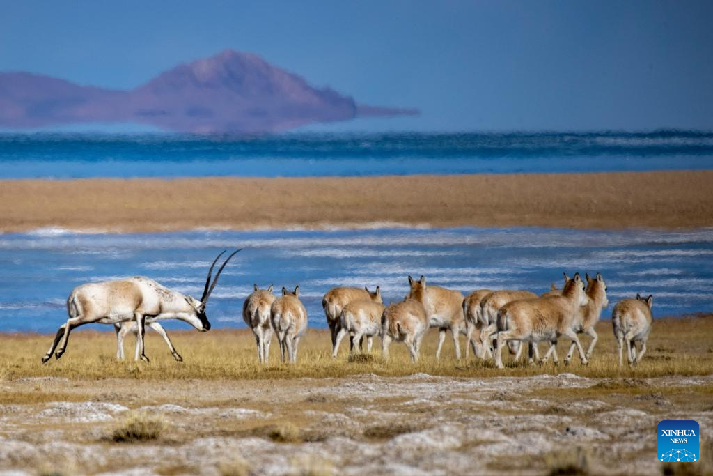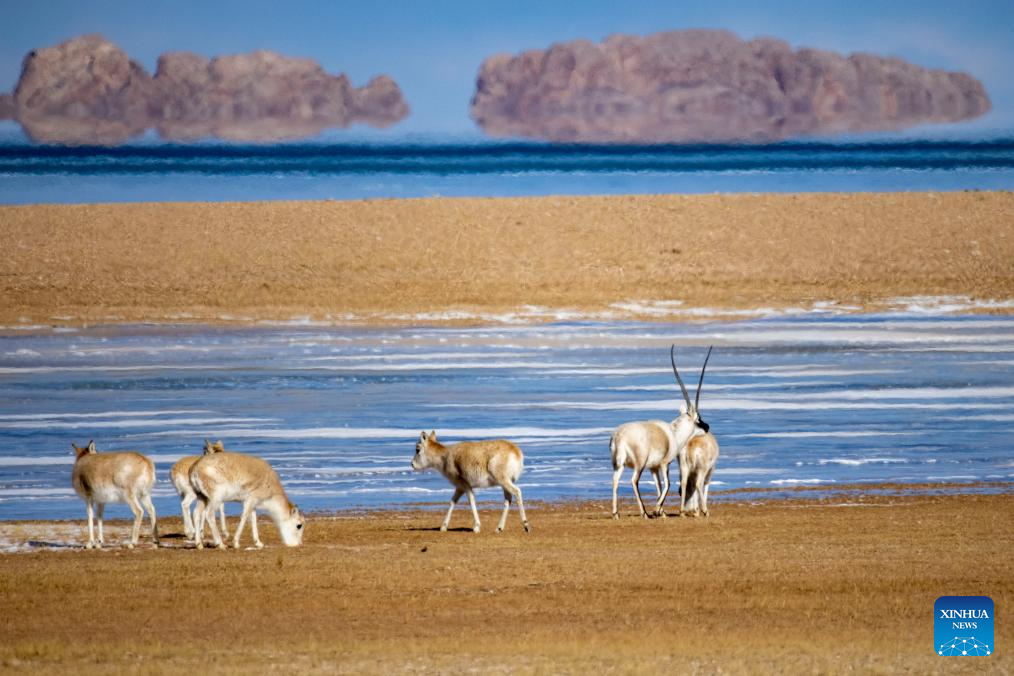 Tibetan antelopes are seen near Serling Tso Lake in southwest China's Xizang Autonomous Region, Jan. 5, 2024. (Xinhua/Jiang Fan)