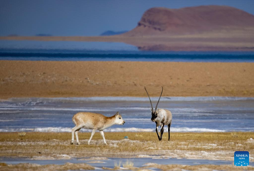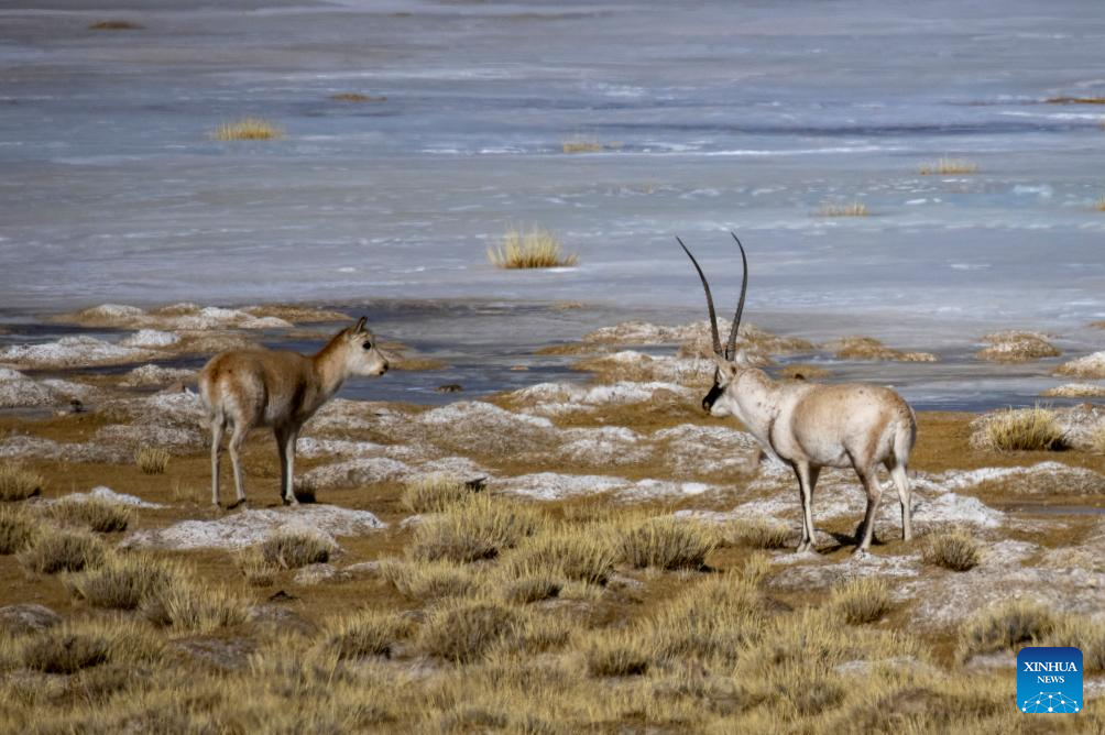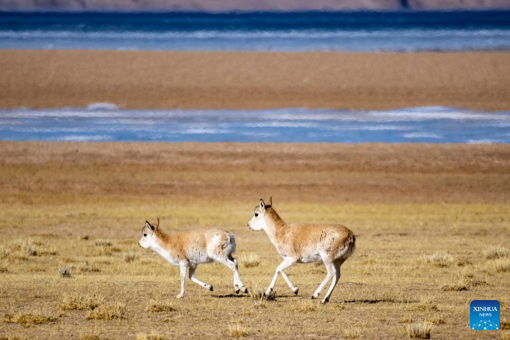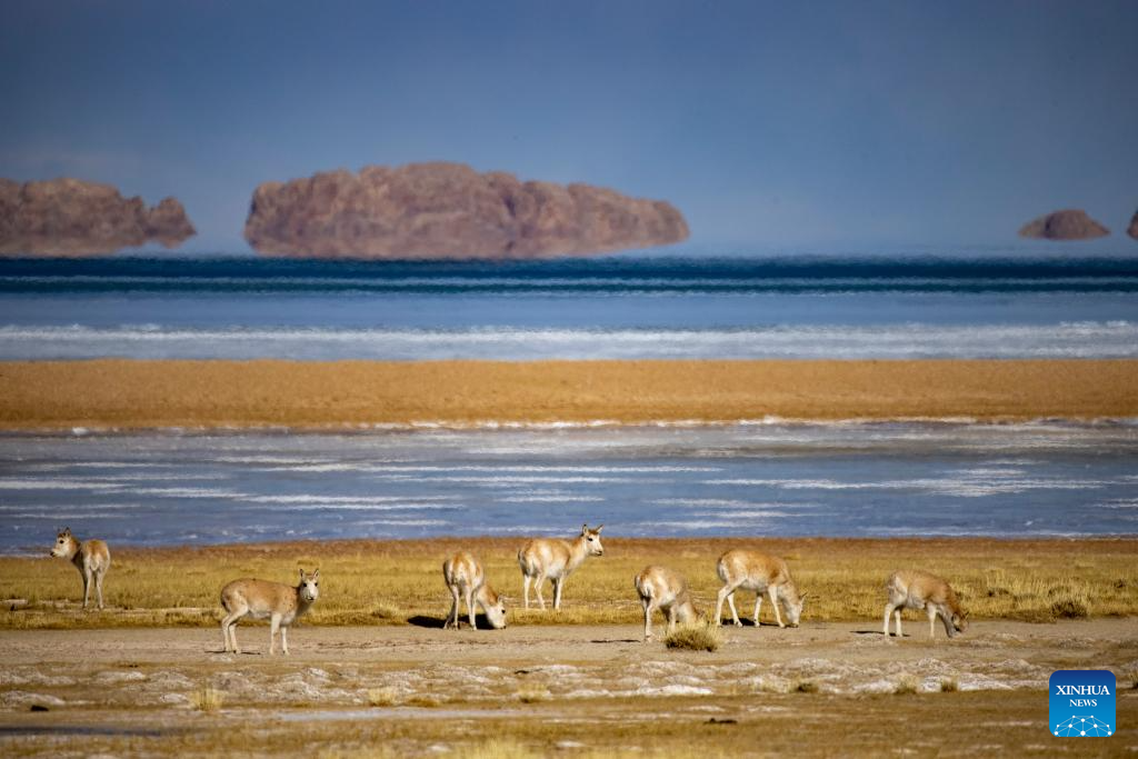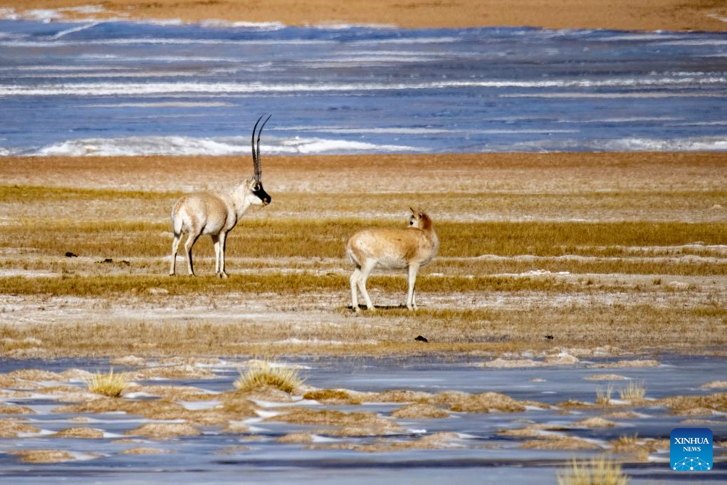 Tibetan antelopes are seen near Serling Tso Lake in southwest China's Xizang Autonomous Region, Jan. 5, 2024. (Xinhua/Tenzing Nima Qadhup)