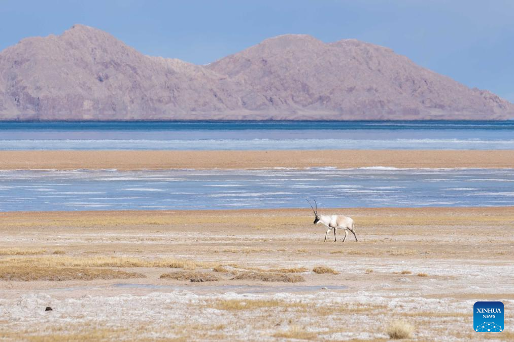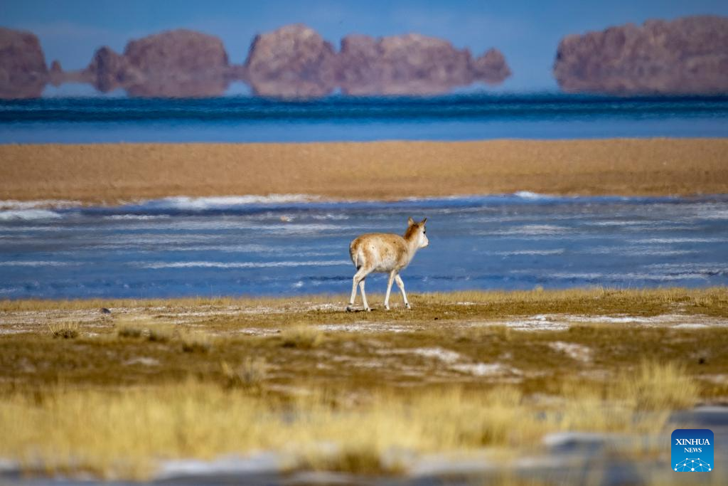 A Tibetan antelope is seen near Serling Tso Lake in southwest China's Xizang Autonomous Region, Jan. 5, 2024. (Xinhua/Jiang Fan)