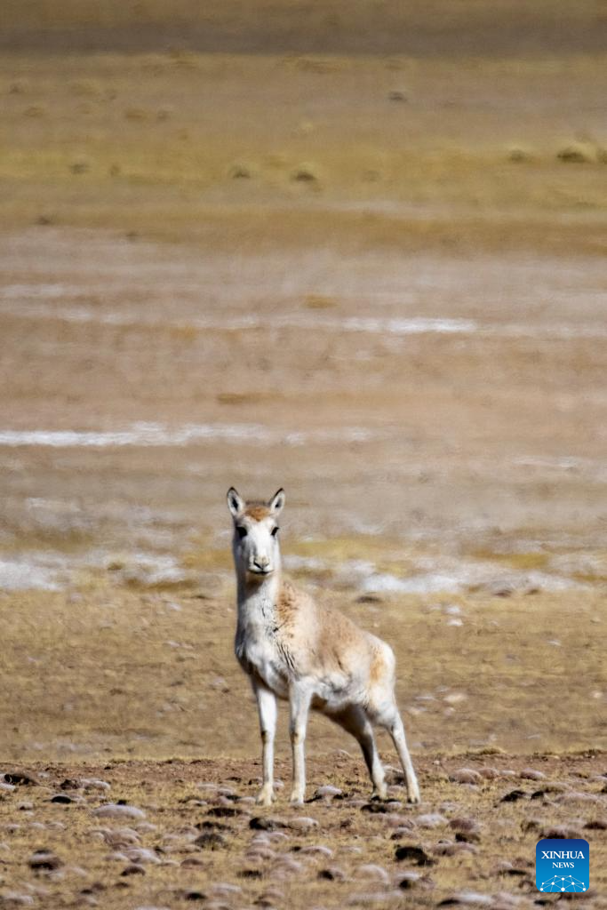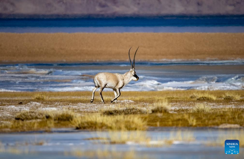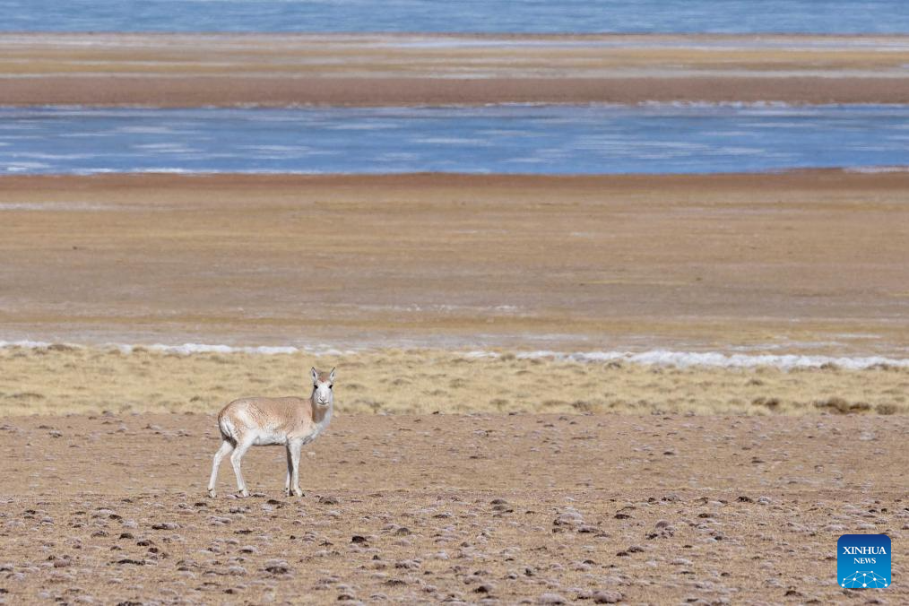 A Tibetan antelope is seen near Serling Tso Lake in southwest China's Xizang Autonomous Region, Jan. 5, 2024. (Xinhua/Tenzing Nima Qadhup)