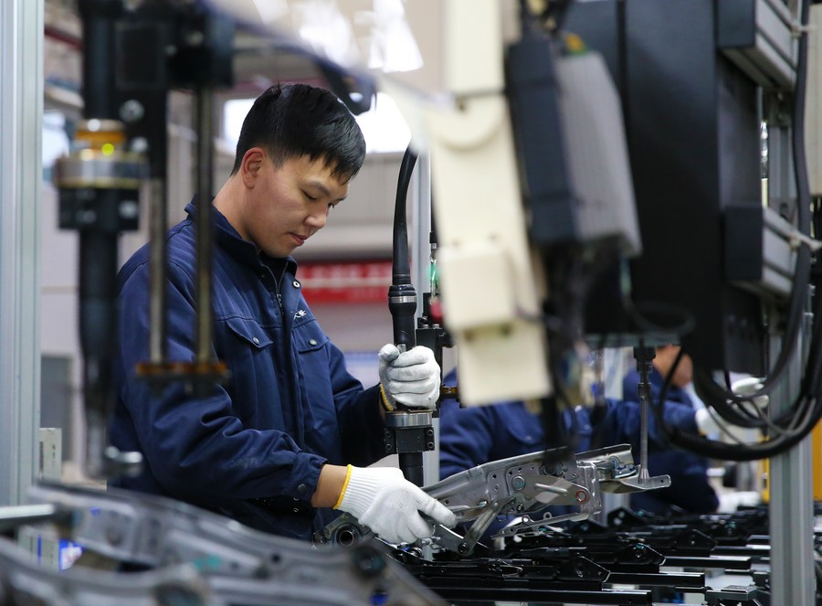 An employee operates at a workshop of the BAIC-Faurecia Automotive Systems Huanghua Branch in Cangzhou City of north China's Hebei Province, Dec. 9, 2020. (Photo by Yuan Liwei/Xinhua)