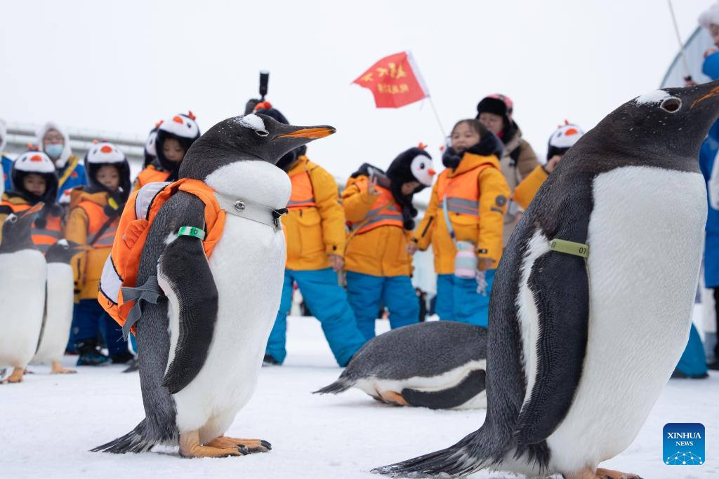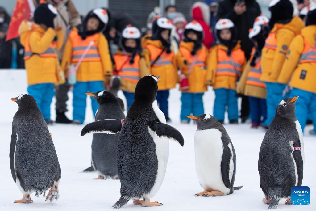 Children from south China's Guangxi Zhuang Autonomous Region meet with penguins as they visit the Harbin Polarpark in Harbin, northeast China's Heilongjiang Province, Jan. 6, 2024. These cute kids, nicknamed "little sugar tangerines" (a specialty produce of Guangxi) by netizens in China, have attracted millions of eyes during their trip to the northeast part of the country. (Xinhua/Zhang Tao)