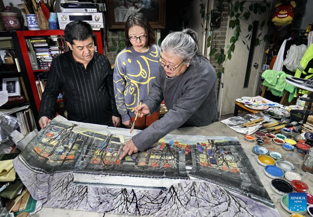Yang Xin (R) introduces one of his traditional Beijing paintings to visitors at his studio in Beijing, capital of China, Jan. 4, 2024. (Xinhua/Li Xin)