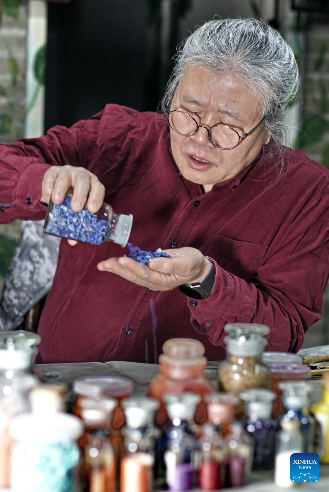 Yang Xin makes pigment with colourful minerals at his studio in Beijing, capital of China, Jan. 4, 2024. (Xinhua/Li Xin)