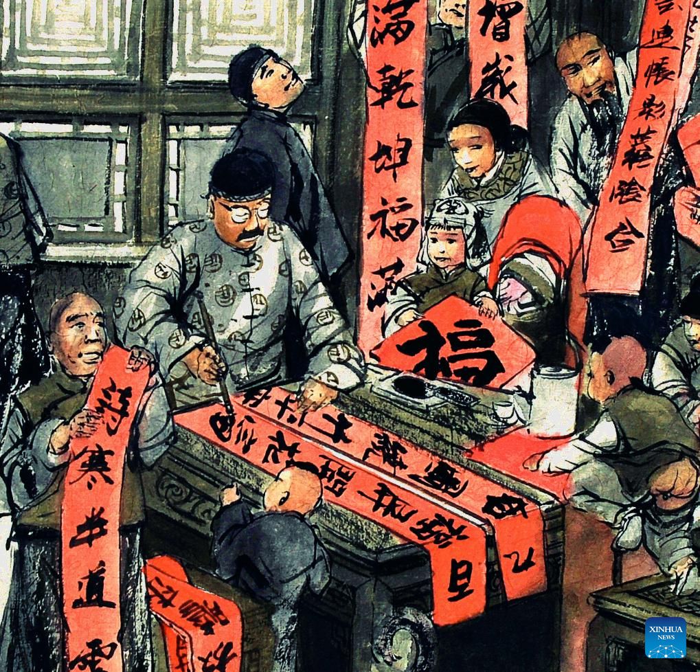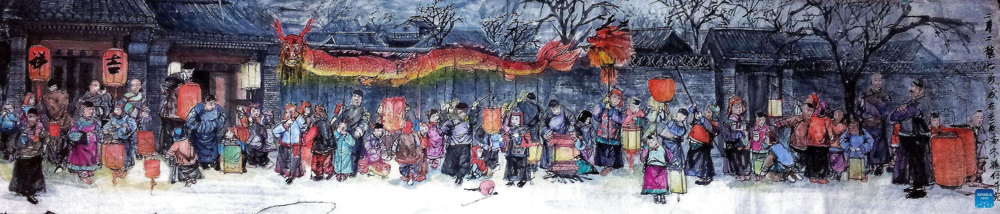 Yang Xin shows his 7-meter-long painting at his studio in Beijing, capital of China, Jan. 4, 2024. (Xinhua/Li Xin)