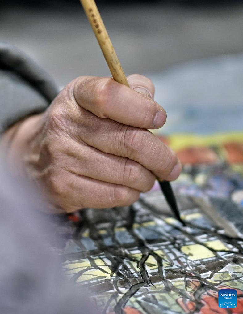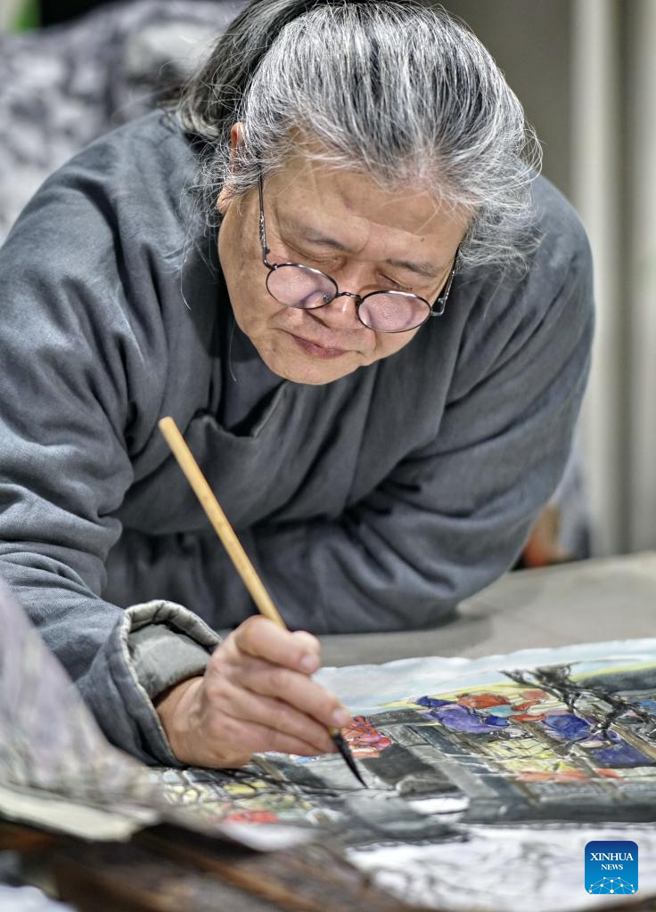 Yang Xin paints with traditional pigment at his studio in Beijing, capital of China, Jan. 4, 2024. (Xinhua/Li Xin)