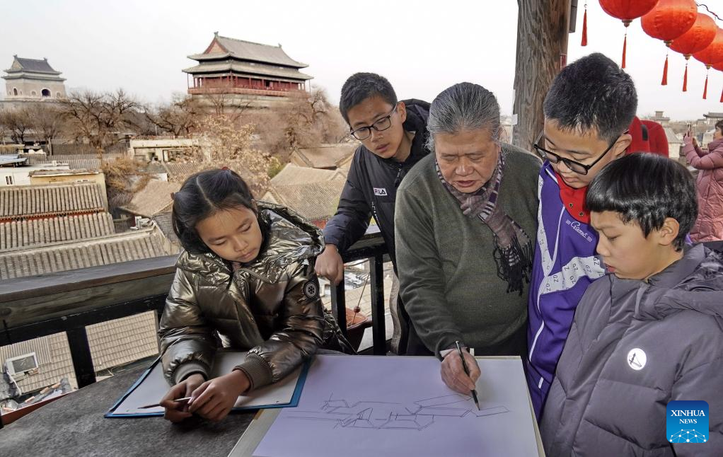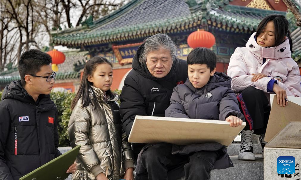 Yang Xin (C) instructs young hobbyists of traditional Beijing paintings in sketching from life in Beijing, capital of China, Dec. 30, 2023. (Xinhua/Li Xin)