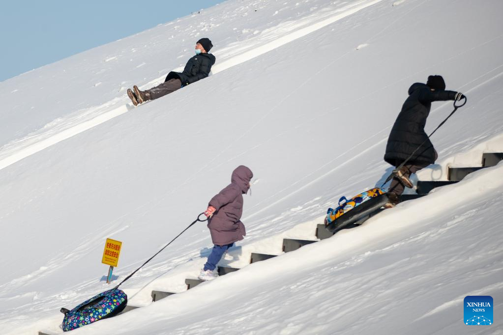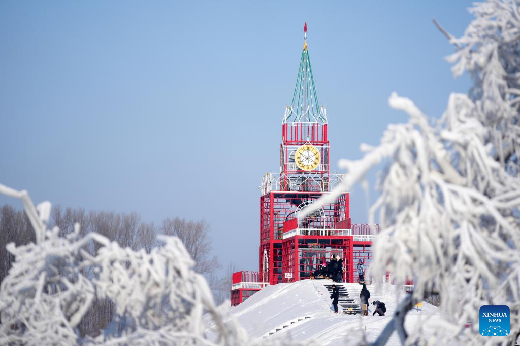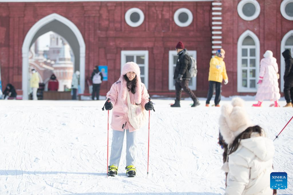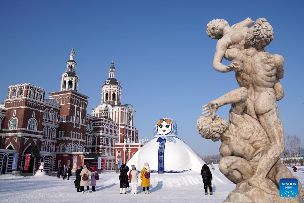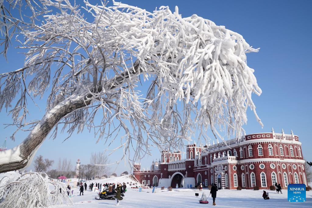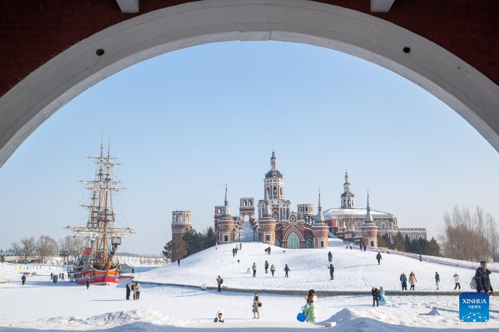 People enjoy themselves at the Volga Manor in Harbin, northeast China's Heilongjiang Province, Jan. 7, 2024. The Volga Manor, a Russian culture-themed park, turned into a world of ice and snow during the winter time, attracting lots of visitors. (Xinhua/Wang Jianwei)