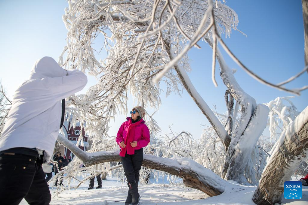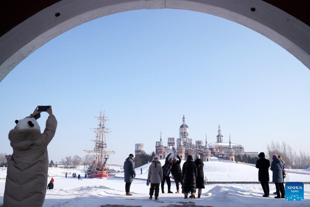 People pose for photos at the Volga Manor in Harbin, northeast China's Heilongjiang Province, Jan. 7, 2024. The Volga Manor, a Russian culture-themed park, turned into a world of ice and snow during the winter time, attracting lots of visitors. (Xinhua/Zhang Tao)
