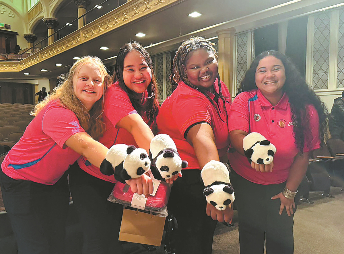 Lincoln High School students pose with gift pandas from Sichuan province at an event celebrating the friendship between Washington State and Sichuan in Tacoma on Nov 20, 2023. LINDA DENG/CHINA DAILY