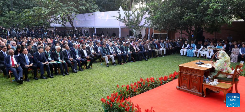 Bangladeshi Prime Minister Sheikh Hasina speaks at a meeting in Dhaka, Bangladesh, on Jan. 8, 2024. The ruling Bangladeshi Awami League (AL) party led by Prime Minister Sheikh Hasina has won 223 out of 298 seats in the country's parliamentary elections, according to the Chief Election Commissioner Kazi Habibul Awal on Monday. (PMO/Handout via Xinhua)
