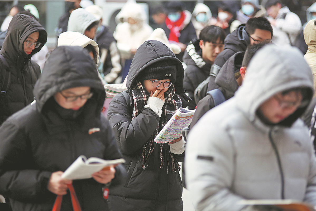 Students taking the postgraduate studies entrance exam glance at their textbooks before entering the examination rooms at Jiangsu University of Technology in Jiangsu Province on Dec 23. CHEN WEI/XINHUA