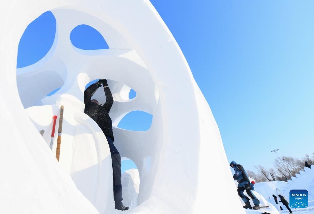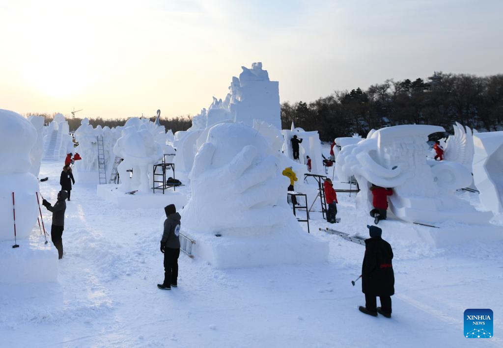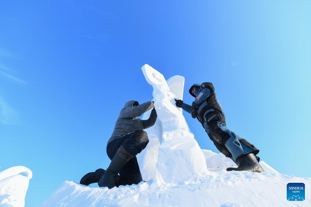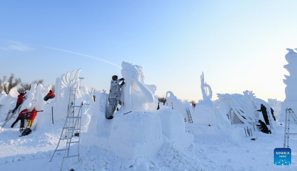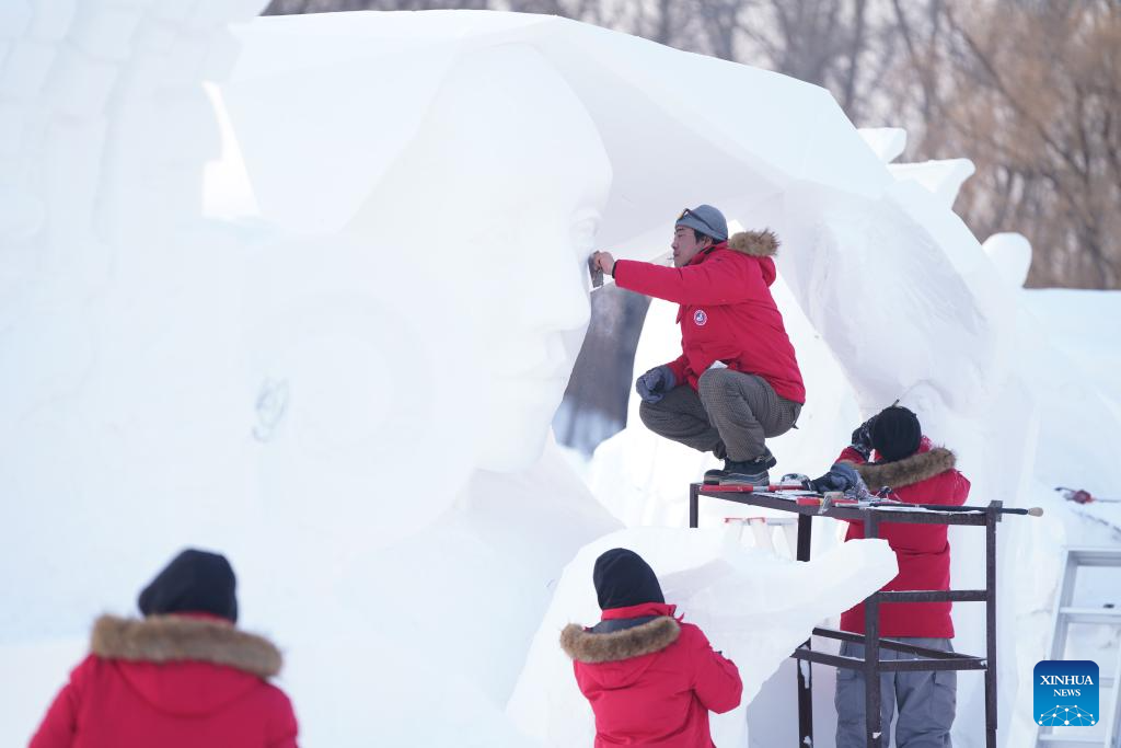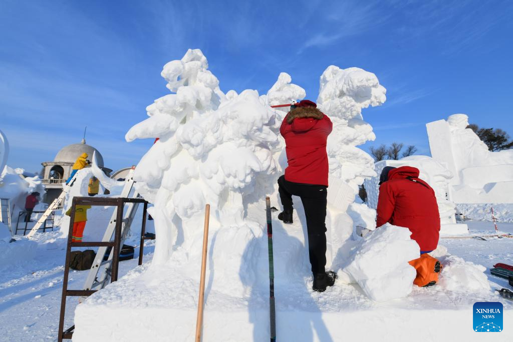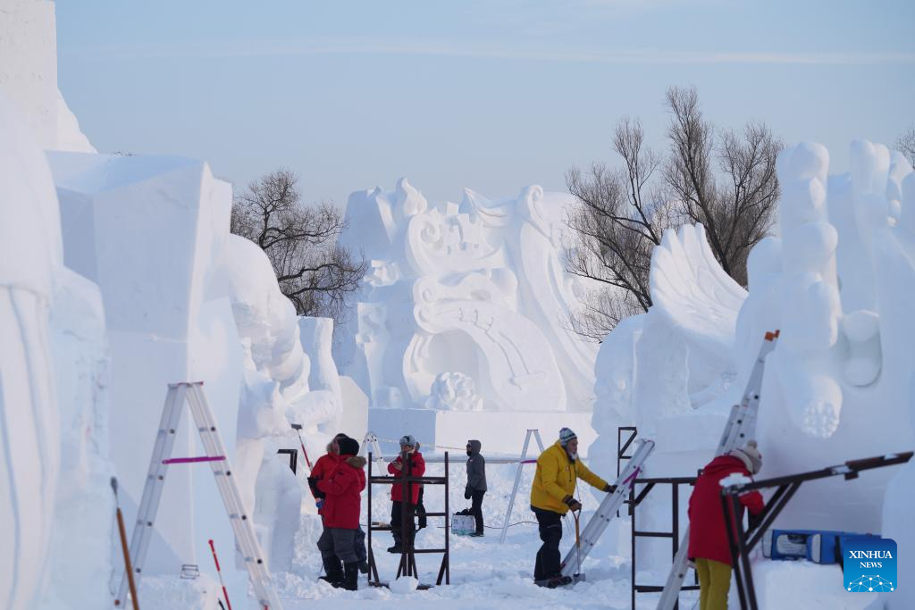 Contestants work on a snow sculpture at the Sun Island scenic area in Harbin, northeast China's Heilongjiang Province, Jan. 8, 2024. The international snow sculpture competition in Harbin entered its third day on Monday. (Xinhua/Wang Song)
