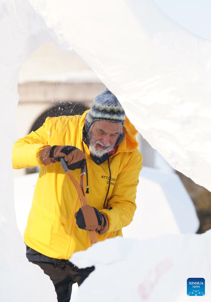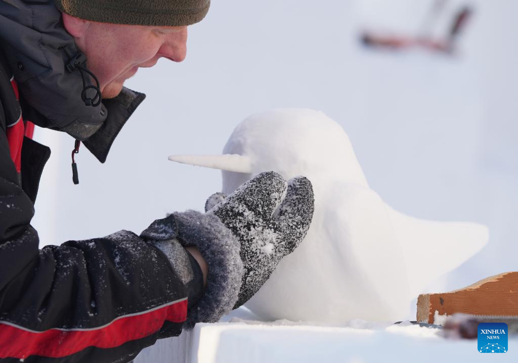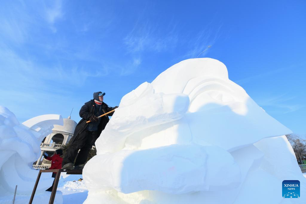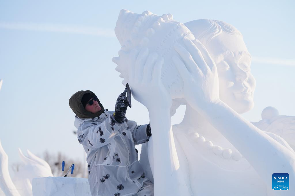 A contestant works on a snow sculpture at the Sun Island scenic area in Harbin, northeast China's Heilongjiang Province, Jan. 8, 2024. The international snow sculpture competition in Harbin entered its third day on Monday. (Xinhua/Wang Song)