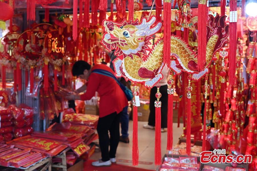 People shop Spring Festival decorations at a market in Guangzhou, south China's Guangdong Province, Jan. 8, 2024. (Photo: China News Service/Chen Chuhong)