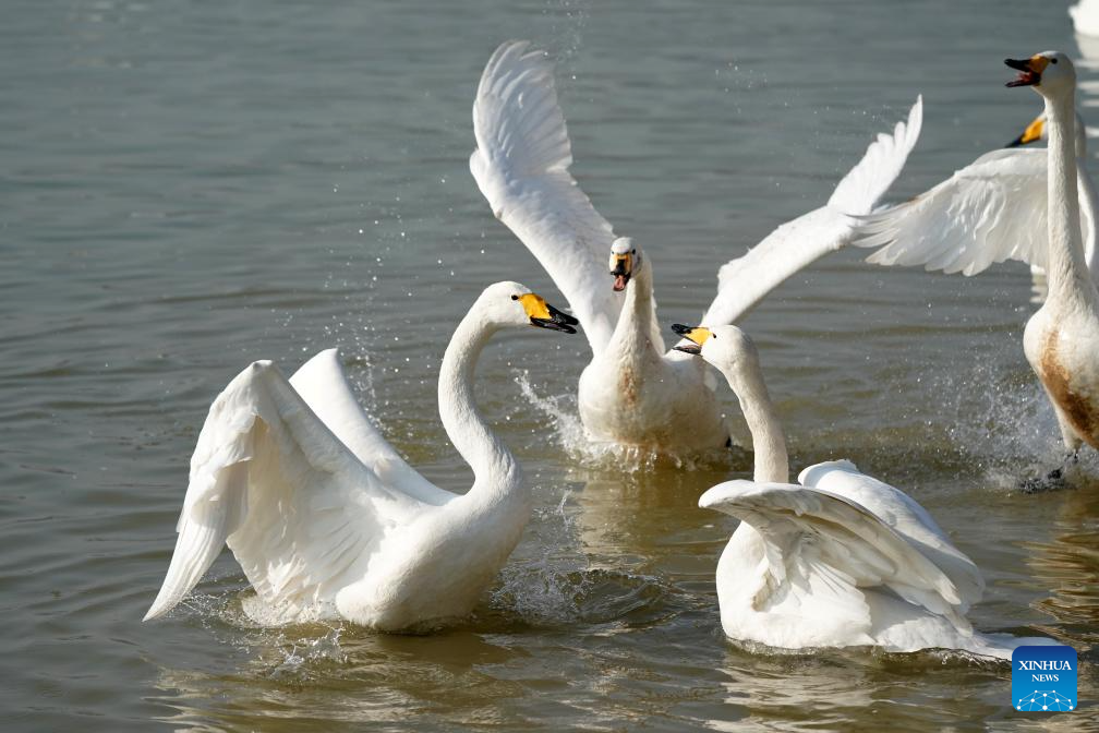 White swans are seen at Pinglu Yellow River Wetland in Pinglu County of Yuncheng, north China's Shanxi Province, Jan. 9, 2024. The Pinglu Yellow River Wetland, covering over 6,000 hectares, has a pleasant climate and abundant food, and is one of China's winter habitats for white swans. (Xinhua/Zhan Yan)