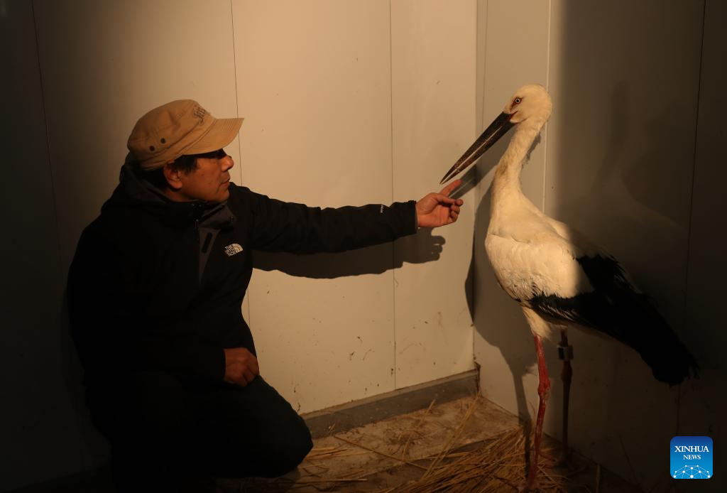A staff member prepares to put a GPS tracker on an oriental white stork at Shenyang Raptor Rescue Center in Shenyang, northeast China's Liaoning Province, Jan. 5, 2024. (Xinhua/Yang Qing)