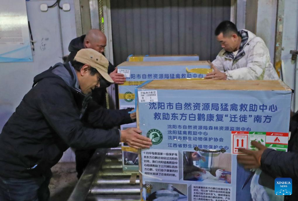 Wang Weiyan (L), head of Shenyang Raptor Rescue Center, prepares to transfer oriental white storks at the Taoxian International Airport in Shenyang, northeast China's Liaoning Province, Jan. 6, 2024. (Xinhua/Yang Qing)