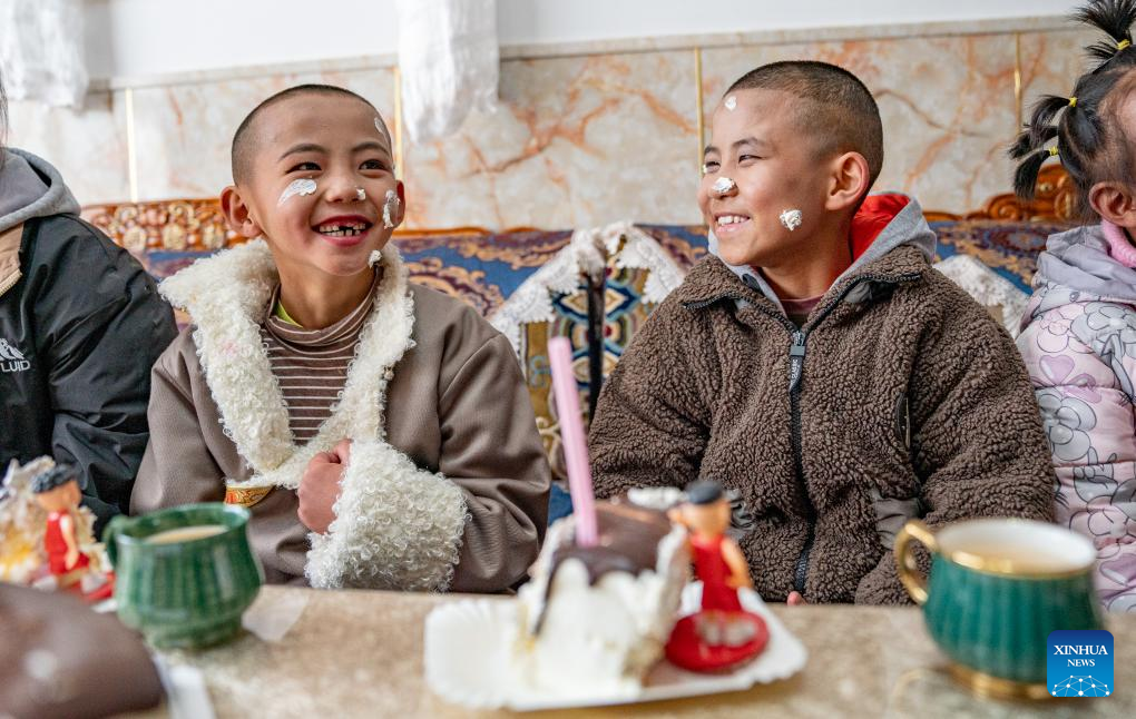 Children enjoy a cake at a welfare house in Xigaze, southwest China's Xizang Autonomous Region, Jan. 8, 2024. (Photo by Tenzin Nyida/Xinhua)