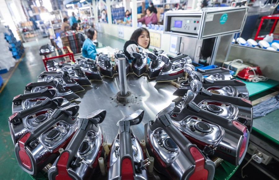 A worker checks the quality of electric irons to be exported to the United States at a workshop of Ningbo AIJIA Electrical Appliances Co., Ltd. in Cixi City, east China's Zhejiang Province, Dec. 27, 2023. (Xinhua/Xu Yu)