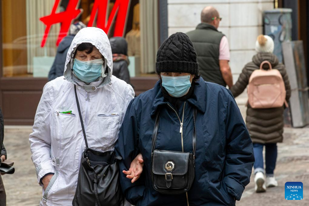 A man wearing a face mask is seen in Athens, Greece, on Jan. 10, 2024. Greek government urged further increase in vaccination rates against COVID-19 and influenza on Wednesday, amid a surge of infections in recent weeks. (Xinhua/Marios Lolos)