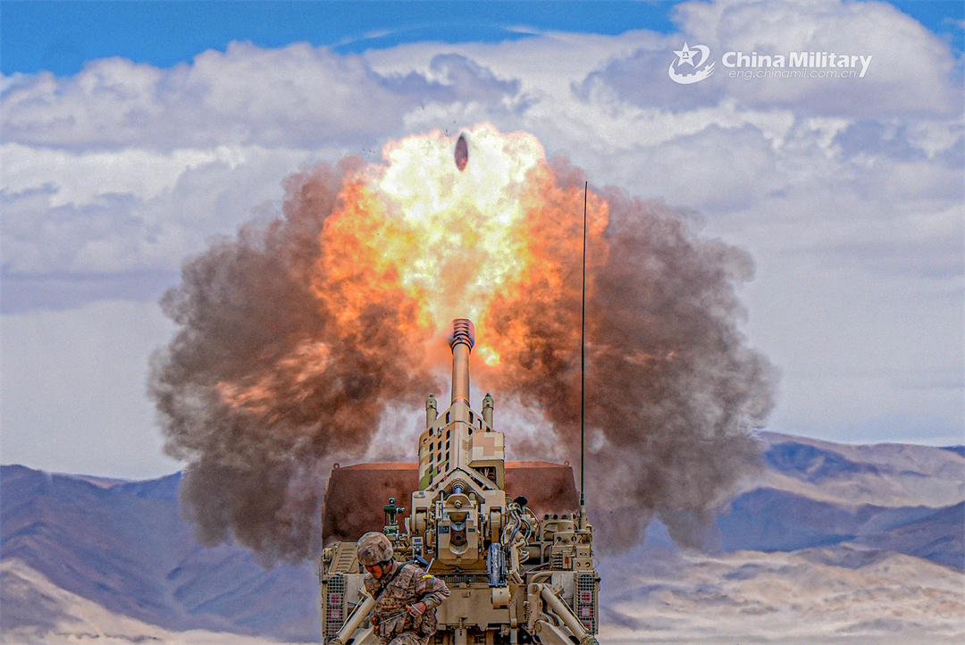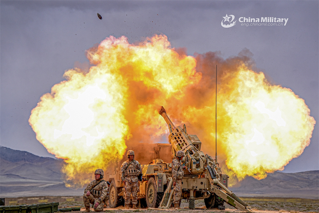 A vehicle-mounted howitzer attached to an artillery element of the army under the Chinese PLA Xinjiang Military Command fires at mock targets in a day and night live-fire training exercise on December 26, 2023. (eng.chinamil.com.cn/Photo by Duan Jie)