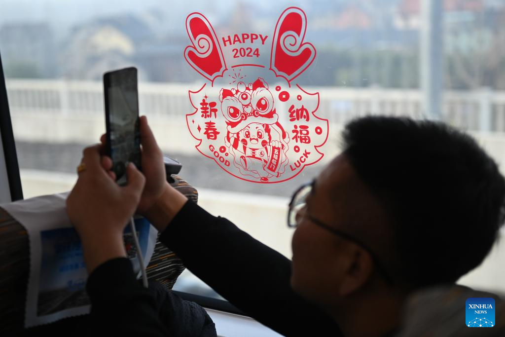 Staff members perform for passengers on a bullet train heading directly for Guangzhou East Railway Station in south China's Guangdong Province from Hangzhou West Railway Station in Hangzhou City of east China's Zhejiang Province, Jan. 10, 2024. A new passenger train service directly linking Hangzhou West Railway Station in Hangzhou and Guangzhou East Railway Station in Guangzhou was launched on Wednesday. China started to implement a new railway operating plan on the same day. (Xinhua/Huang Zongzhi)