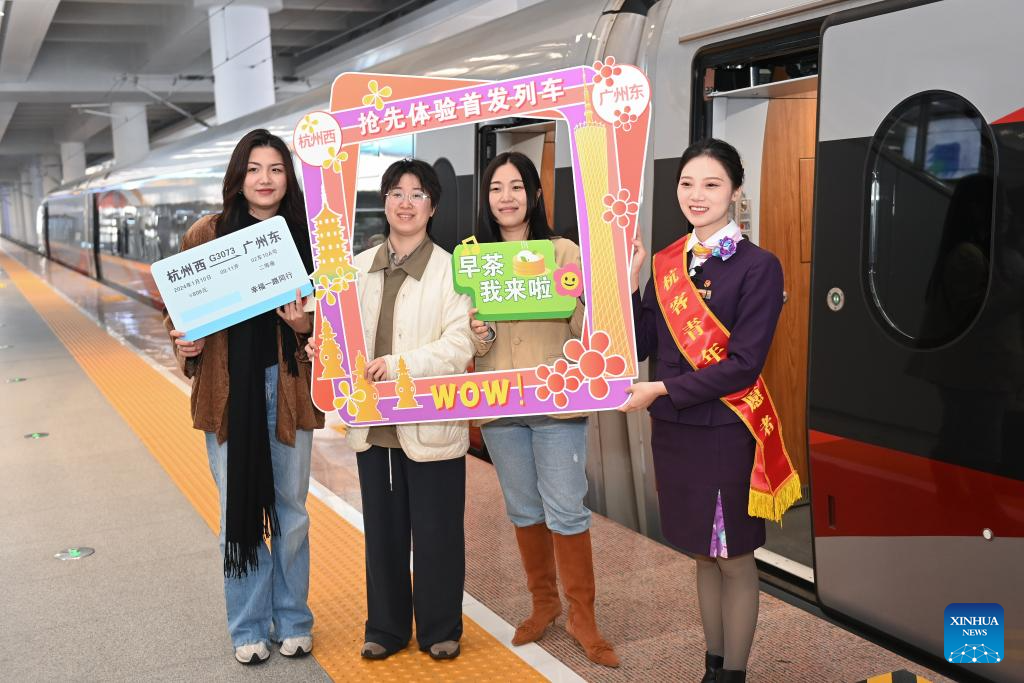 Passengers and staff members pose for a group photo on the first bullet train heading directly for Guangzhou East Railway Station in south China's Guangdong Province from Hangzhou West Railway Station in Hangzhou City of east China's Zhejiang Province, Jan. 10, 2024. A new passenger train service directly linking Hangzhou West Railway Station in Hangzhou and Guangzhou East Railway Station in Guangzhou was launched on Wednesday. China started to implement a new railway operating plan on the same day. (Xinhua/Huang Zongzhi)