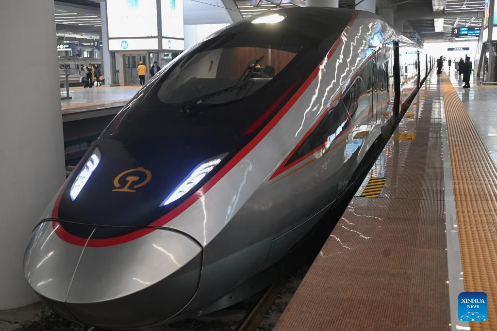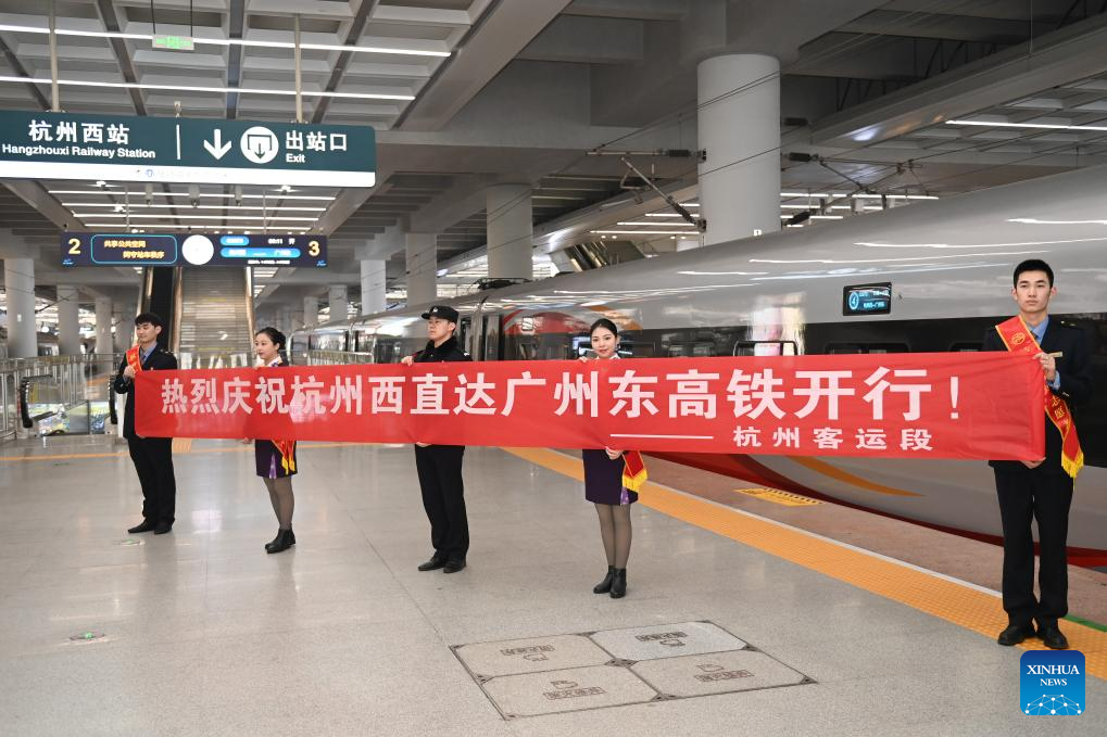 This photo taken on Jan. 10, 2024 show a bullet train heading directly for Guangzhou East Railway Station in south China's Guangdong Province, at Hangzhou West Railway Station in Hangzhou, east China's Zhejiang Province. A new passenger train service directly linking Hangzhou West Railway Station in Hangzhou and Guangzhou East Railway Station in Guangzhou was launched on Wednesday. China started to implement a new railway operating plan on the same day. (Xinhua/Huang Zongzhi)