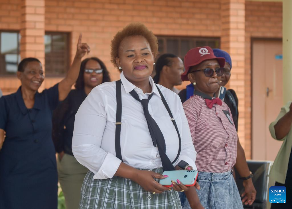 Gagoitsiwe Marata (Front), the headmistress of Mmopane Primary School, attends a celebration of the school's excellence, in Mogoditshane, Kweneng District, Botswana, on Jan. 9, 2024. China-aided Mmopane Primary School celebrated its first-ever Primary School Leaving Examination (PSLE) in style on Tuesday, topping Kweneng District in southern Botswana with a pass rate of 98.3 percent. (Photo by Tshekiso Tebalo/Xinhua)