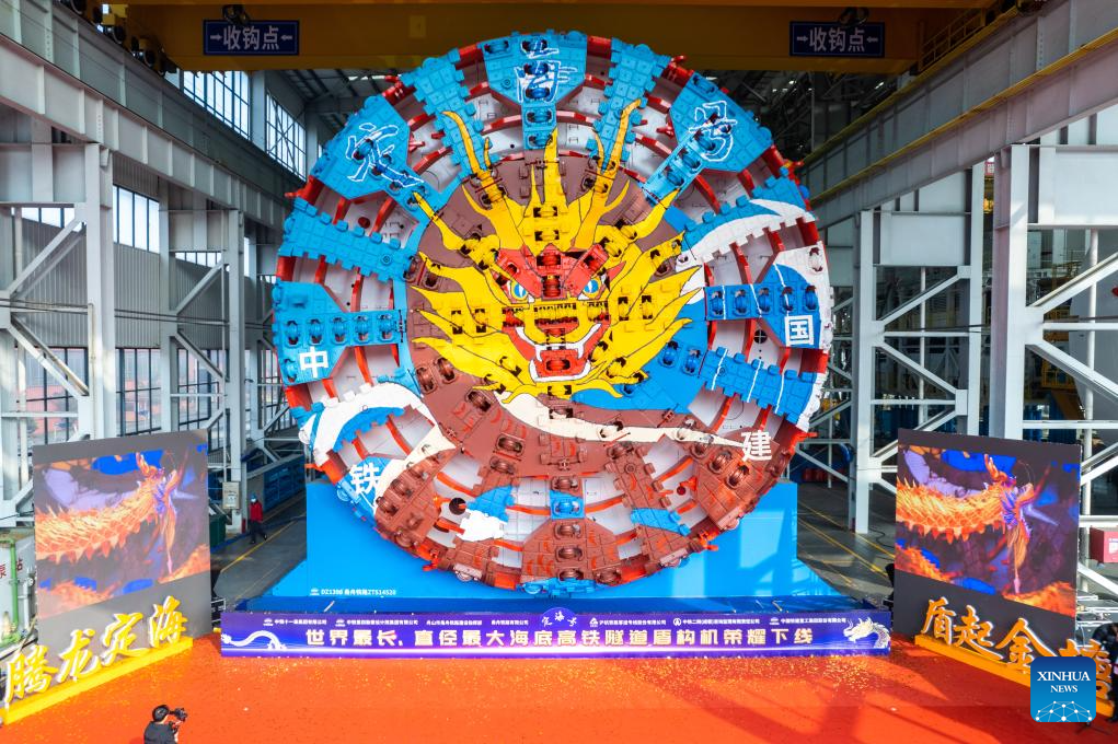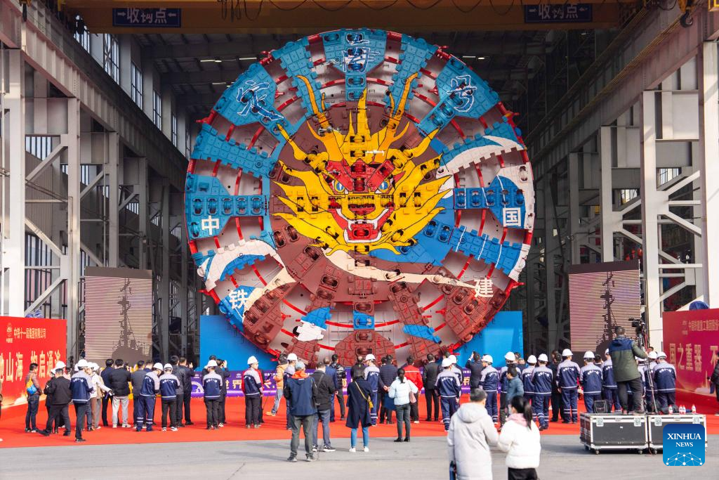 The tunnel boring machine (TNM) Dinghai is seen at an industrial park of China Railway Construction Heavy Industry Corporation Limited in Changsha, central China's Hunan Province, Jan. 10, 2024. With a diameter of 14.57 meters and a total weight of 4,350 tonnes, the TNM Dinghai will be used in the construction of Jintang undersea tunnel linking the Jintang islet of Zhoushan and the coastal area of Ningbo. (Xinhua/Chen Sihan)