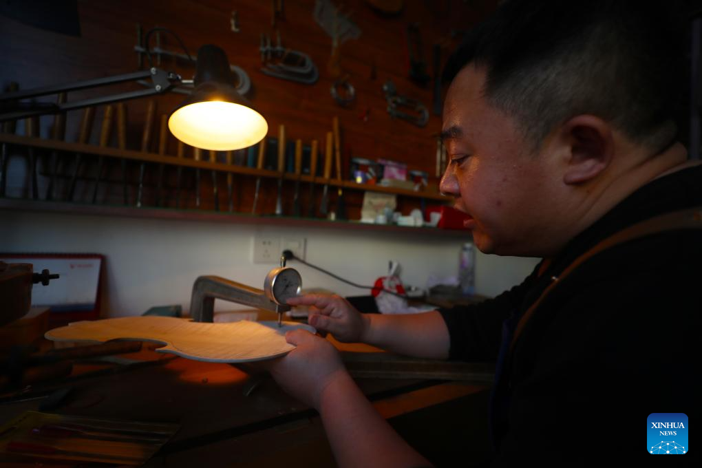 Yu Haixu makes a violin at his studio in Yingkou, northeast China's Liaoning Province on Jan. 9, 2024.(Xinhua/Yang Qing)