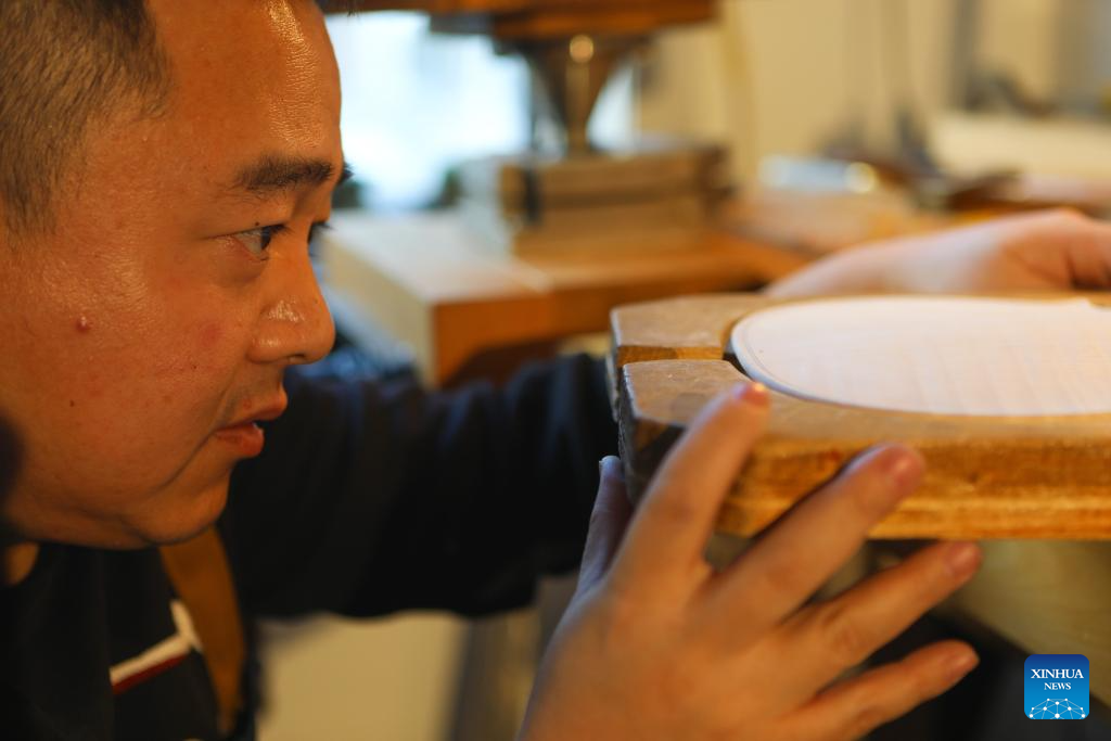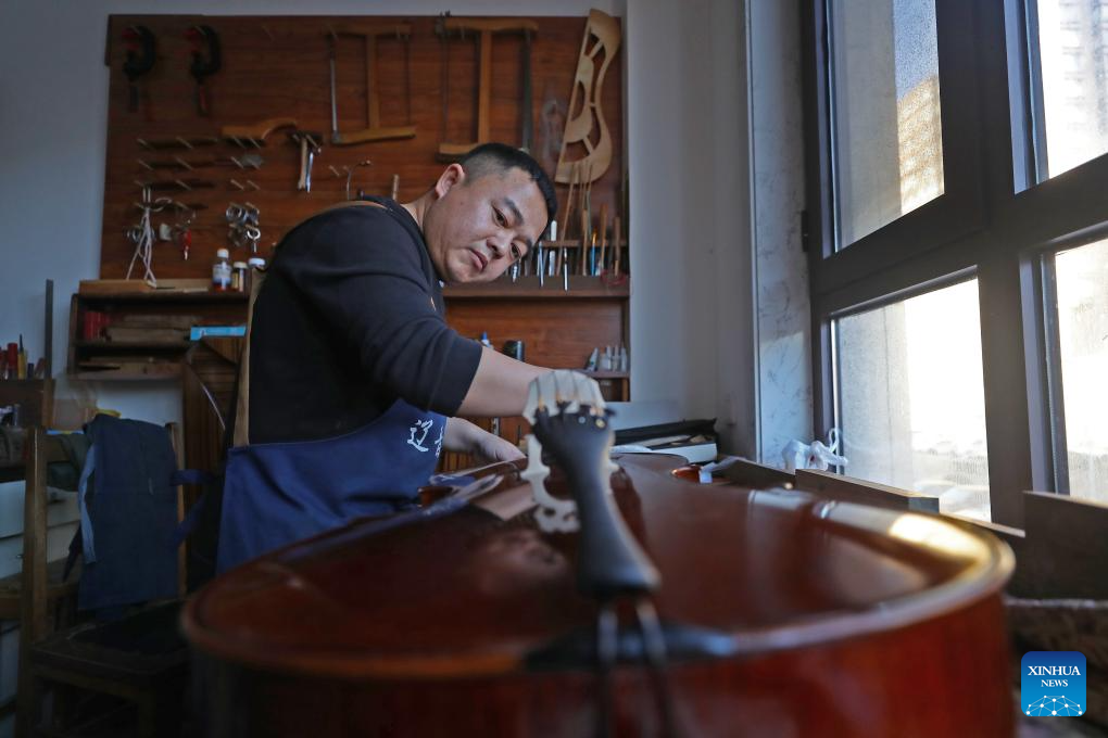 Yu Haixu makes a cello at his studio in Yingkou, northeast China's Liaoning Province on Jan. 9, 2024.(Xinhua/Yang Qing)